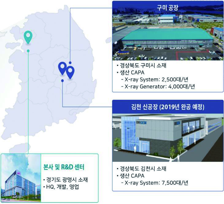 공장에서의 생산가능한 규모도 김천공장을 새롭게 건축하면서 증가하였는데, 구미 공장에서는 연간 X-선 장비는 4,000대, X-선 장비의 주요 부품인 고전압발생장치는 ,000대를 생산 할 수 있는 규모 였다면, 김천공장은 연간 X-선 장비는 12,000대, 고전압 발생장치는 15,000대를 생산할 수 있는 규모이다.