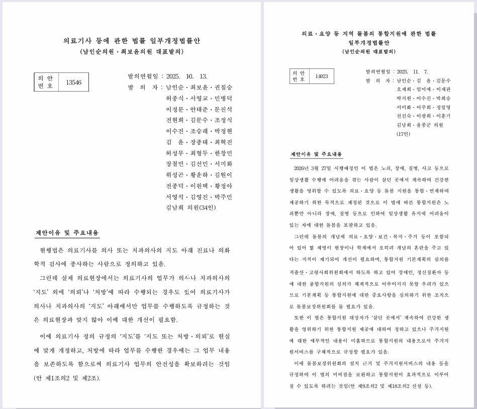이번 개정안은 남인순 의원(더불어민주당)과 최보윤 의원(국민의힘) 등 34인이 공동 발의한 「의료기사 등에 관한 법률 일부 개정 법률안」으로, 의료기사의 정의 규정 중 “의사 또는 치과의사의 지도 아래”라는 표현을 “의사 또는 치과의사의 지도 또는 처방·의뢰 아래”로 개정하는 내용을 핵심으로 하고 있다.