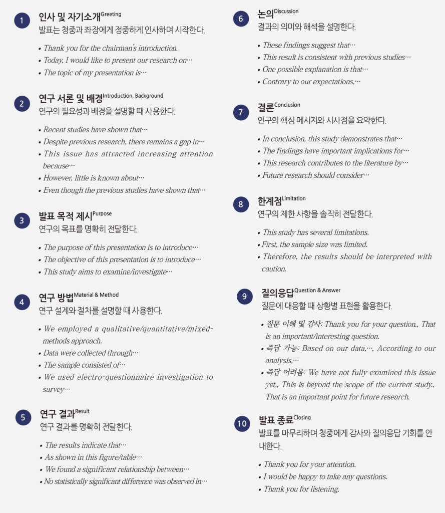 이러한 역량은 단기간에 완성되기 어렵지만, 다수 논문을 꾸준히 읽으며 반복적으로 사용되는 영어 표현을 자연스럽게 익히는 노력이 필요하다. 나아가 이러한 관용적 표현에 익숙해질수록 국제학술대회 구연 발표에서도 학술적 의미가 잘 함축된 단어를 선택해 발표할 수 있게되며, 이는 외국인 학회 참석자들에게 연구 내용을 보다 효과적으로 전달하는 데 큰 도움이 된다.