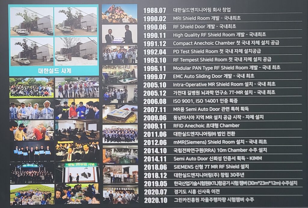 대한실드엔지니어링 사옥 1층에는 그간의 역사를 담은 판넬이 준비되어 있었다. 대한실드엔지니어링은 1988년에 설립되어 36년의 역사를 갖고 있었다. 우리나라에서 MRI 장비의 사용을 시작한게 1988년이라고 하니, 우리나라 MRI 장비의 시작과 대한실드엔지니어링의 시작이 같았다. 또한 대한실드엔지니어링 연혁 중에 국내 최초로 진행한 사례들이 많이 있었다. 이러한 연혁으로 비추어볼 때 이는 우리나라 MRI의 역사가 바로 대한실드엔지니어링의 역사라고 보아도 과언이 아닌 것처럼 생각되었다.